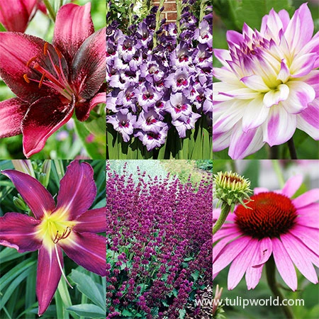 Fill your garden with shades of purple like violet, lavender and orchid. This collection of summer blooming perennials and bulbs blooms in various shades of purple. The bloom shapes vary too to add texture to your garden. Plant this collection of summer blooming bulbs in full to part sun.Â