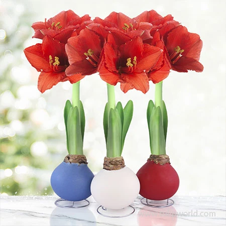 Celebrate the season with our American Spirit Trio Waxed Amaryllis! Give this Collection as a gift or treat yourself this Summer! Easy to grow in a sunny, warm location in your home, no soil or water needed!