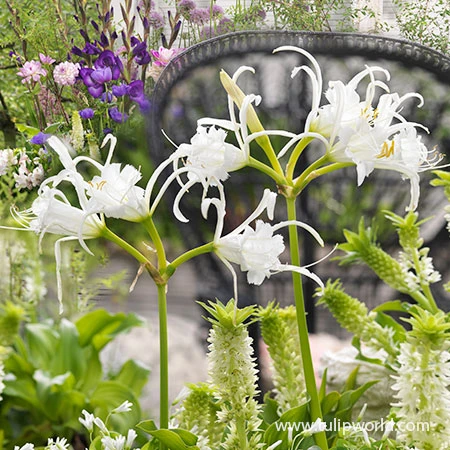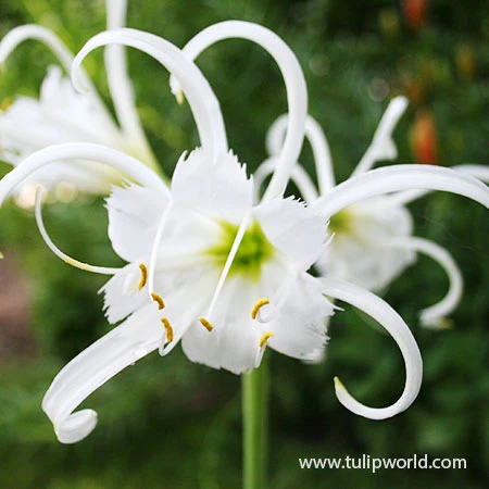 Sometimes called a Spider lily too. The very attractive 4-6 exotic spider-like blooms per stem and have amaryllis like leaves. This plant serves as an exciting focal point when planted in pots. For a true bold impression plant them in large groups.