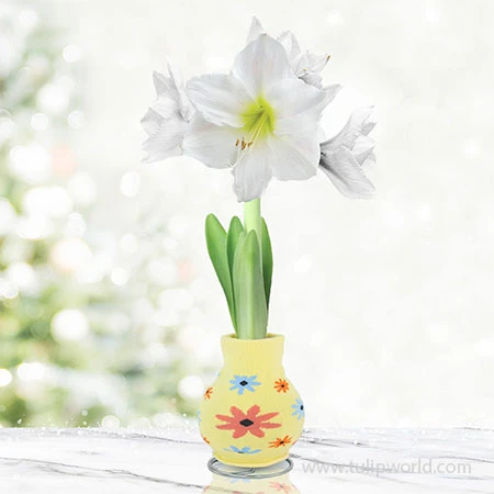 Flora Sweater Amaryllis is a fun and funky sweater amaryllis. The sweater on this amaryllis is yellow with groovy flowers all around. The amaryllis bulb will bloom with pure white flowers within weeks of receiving it. No water, or soil is required to get loads of blooms from the amaryllis bulb inside the sweater, it’s been specially prepared to bloom without extra care. Makes the perfect gift for a friend, family member or yourself!Â