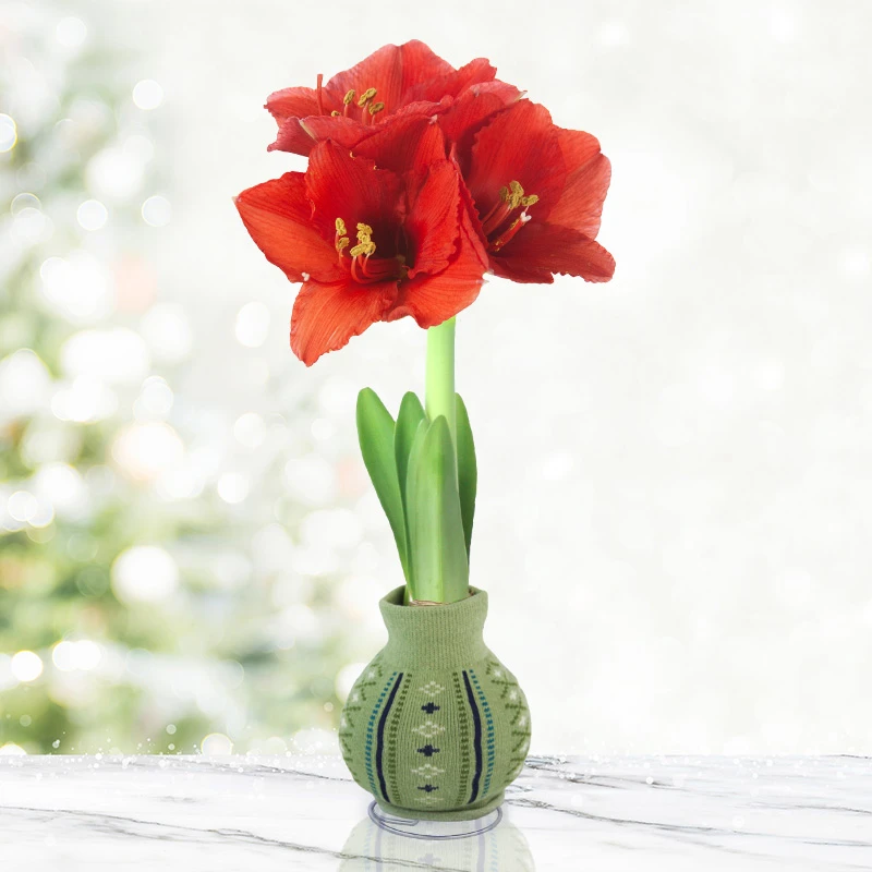 This gleaming Green Gem Sweater Amaryllis makes a delightful gift for any occasion. It includes an easy to grow amaryllis that will bloom within several weeks of receiving. Give the gift of fun, surprise and flowers all in one with the Green Gem Sweater Amaryllis.