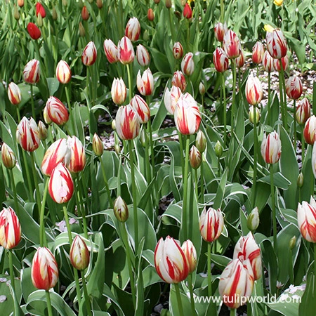 Happy Generation Tulip is a white tulip with red stripes throughout and even shades of yellow appear. This triumph tulip is sturdy and holds up well in the rain and wind that spring weather often brings. Be a happy gardener and plant Happy Generation Tulip in your garden today!