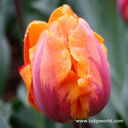 Tulip triumph Princess Irene has a unique orange with red to fuchsia flames. Triumphs are the traditional tulip shape that stands up to bad weather and best choice for forcing!