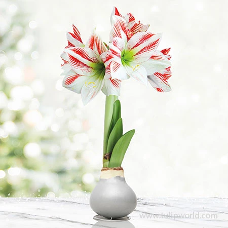Add a little sparkle to your holiday season with the Sugarcane Waxed Amaryllis. All of our waxed Amaryllis are hand selected and house dipped in our custom wax blends. These easy to care for Amaryllis do not require any water or soil. Just place in a bright, sunny location and enjoy watching it grow! Waxed Amaryllis bloom 4-8 weeks after receiving.