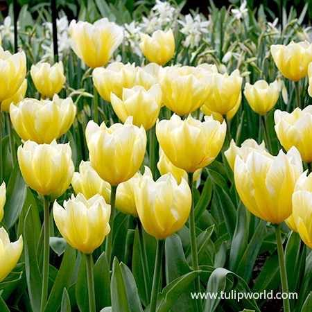 Sweetheart has buttercream yellow blooms in early spring. The long lasting blooms are large and showy. When Sweetheart Fosteriana Tulip is combined with blue hyacinths or grape hyacinths in makes for a classic combination. Fosteriana Tulips are among some of the most reliable tulips for returning for several seasons.